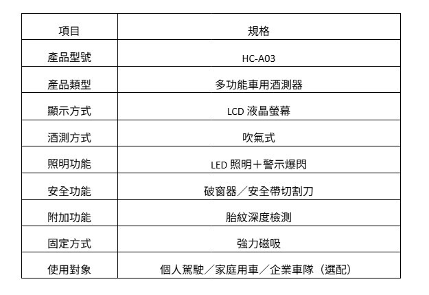 HC-A03 多功能車用酒測器專為 個人駕駛與家庭用車 設計,結合酒精濃度檢測與多項行車安全輔助功能,讓駕駛在開車前、行車中與緊急狀況下都能多一層保障。